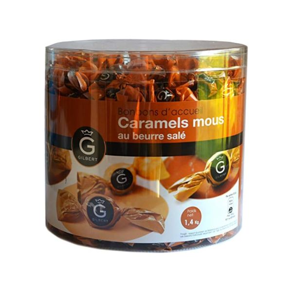 GILBERT vous présente ses irrésistibles bonbons d'accueil, des caramels mous au beurre salé, présentés dans un généreux sachet de 1,4 kg. Laissez-vous séduire par leur douceur fondante et leur délicieuse saveur de beurre salé, parfaits pour accueillir vos invités avec gourmandise.